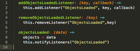 As I mentioned earlier, this is a CoffeeScript file. Notice how the add/remove methods hide the event names from the caller and register/deregister the listener in an internal hash of listeners.